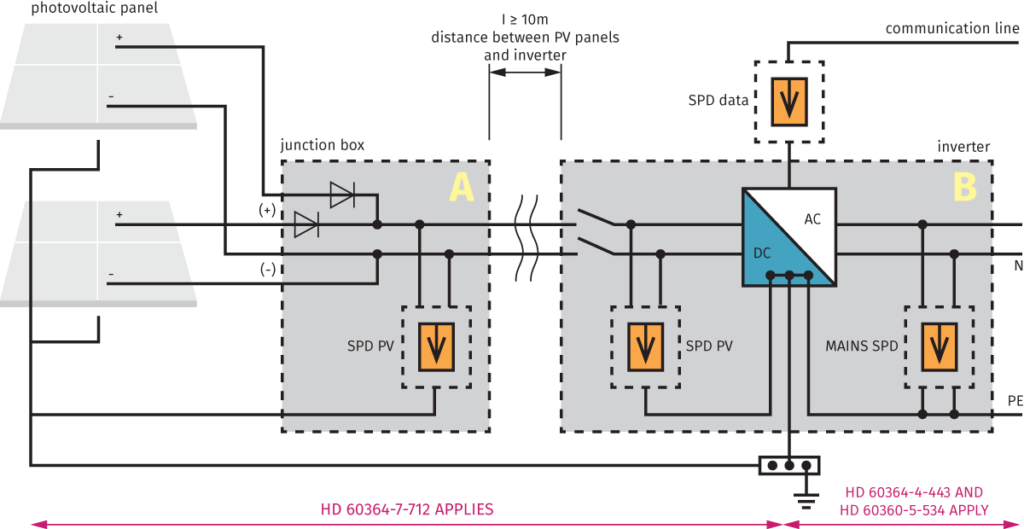 The inverter should be protected on both the DC side and the AC side, additionally, if the PV arrays are over 10m away from the inverter, an SPD must be installed at the junction box that is local to that PV array.