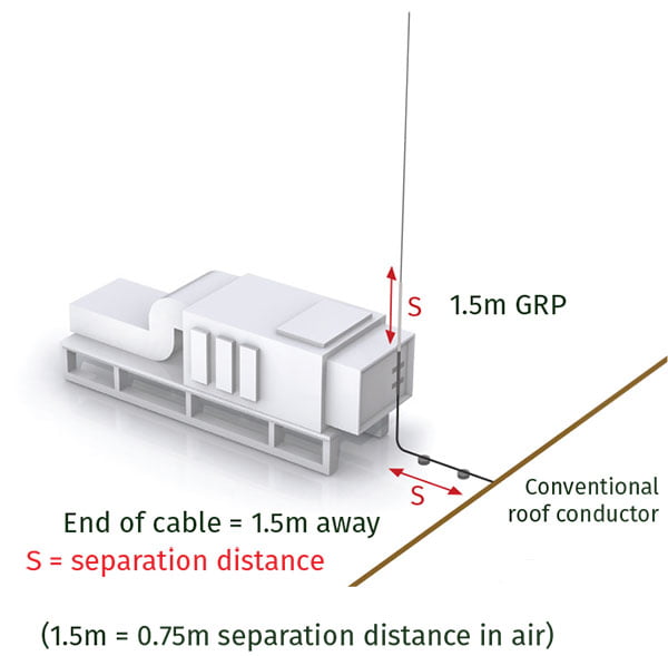 The insulated lightning conductor cable should be connected to the rest of the roof mesh (bare or PVC covered conductor) not less than 1.5m away from the object being protected.