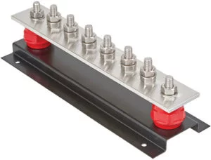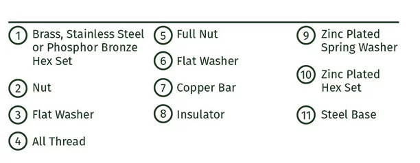 Kingsmill supply all Earth Bars on metallic bases. All standard stock Earth Bars up to 12 ways (standard, single and twin link) are supplied on powder coated bases. Kingsmill can also supply galvanised and hot-dipped galvanised bases for use in external or more humid environments eg coastal.