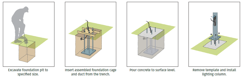In some areas root mounting is not suitable for lighting columns and a flange base can be used instead. This involves a concrete foundation and hence a longer installation time, but can be particularly useful in built-up areas including rail platforms, multi-storey car parks and parapets.