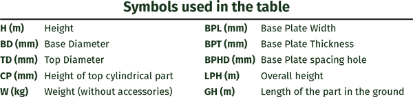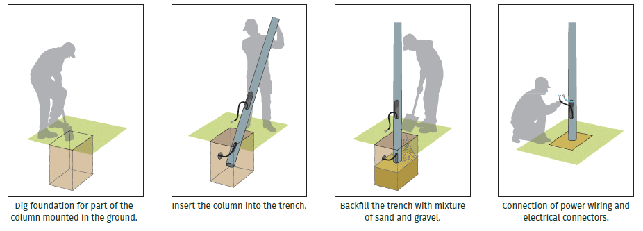 Root mounted columns are installed into a suitably sized hole or socket in the ground, which is then back-filled. Alternatively, they can be installed into a socket prepared in the ground, slightly larger than the column diameter and then back-filled.