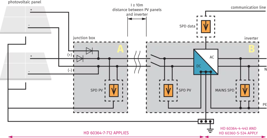 The inverter should be protected on both the DC side and the AC side, additionally, if the PV arrays are over 10m away from the inverter, an SPD must be installed at the junction box that is local to that PV array.