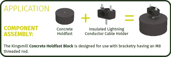 The Concrete Holdfast Block is used for securing Insulated Lightning Conductor Cable Holders in place on flat surfaces where direct fixing isn’t possible.