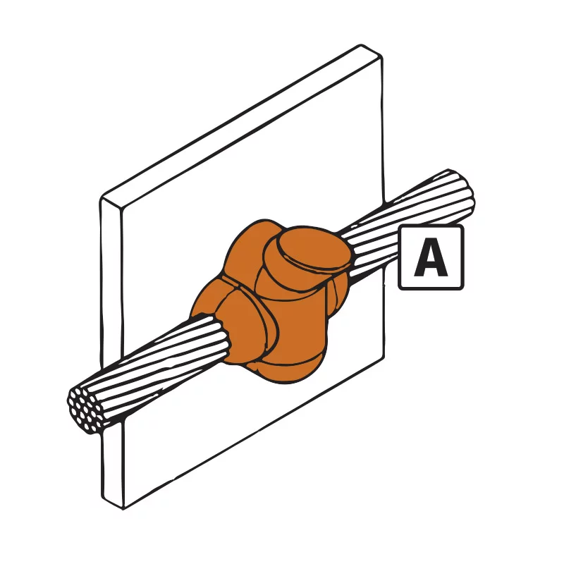Horizontal thru Cable to Vertical Steel Surface Joint- CS27 is a cable to surface exothermic welded connection that requires a HCD Handle Clamp.