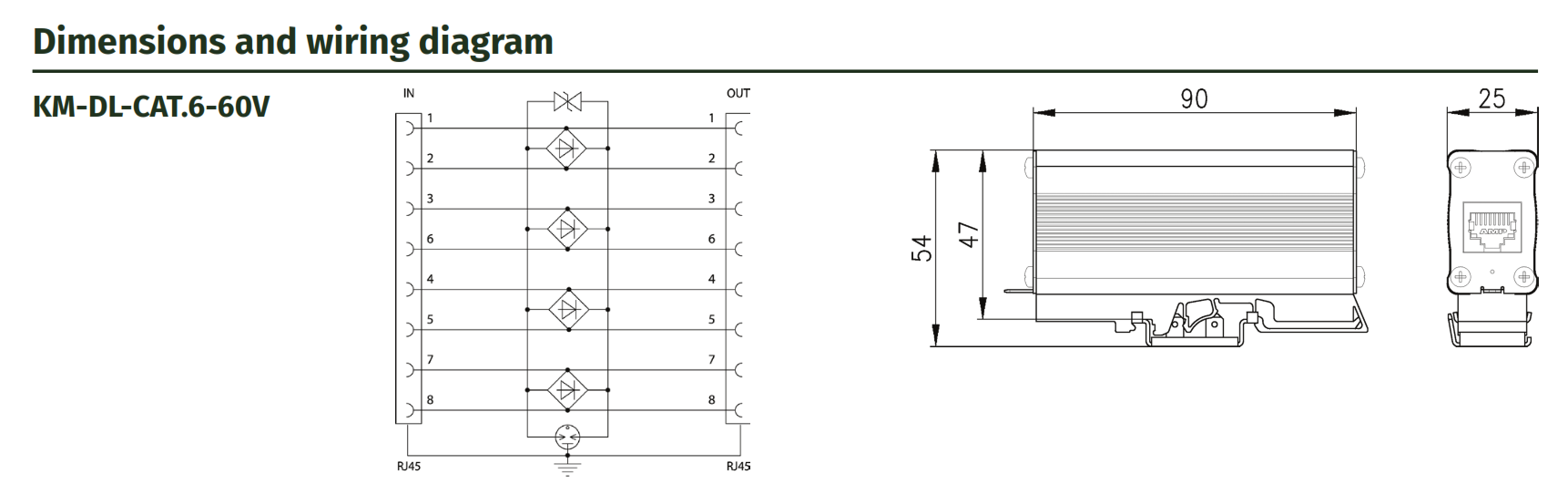 Surge arrester for Ethernet is a combination of coarse and fine protection of ethernet lines with Power over Ethernet (PoE). For the protection of ethernet line Cat 6 with PoE Mode A, B against surge voltages.