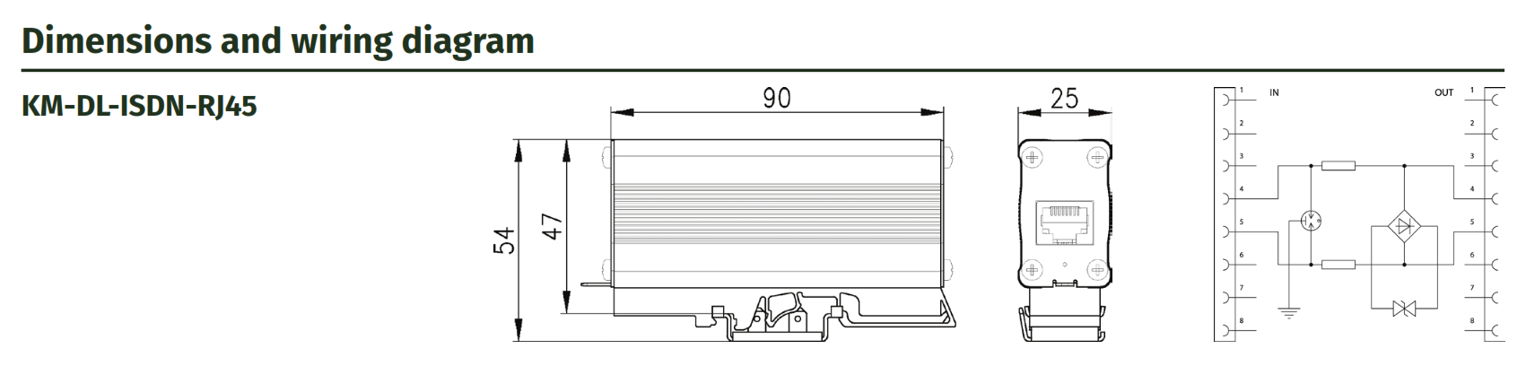 Surge arrester for telephone lines – RJ45 sockets protects a single pair of ISDN lines in telecommunication equipment.