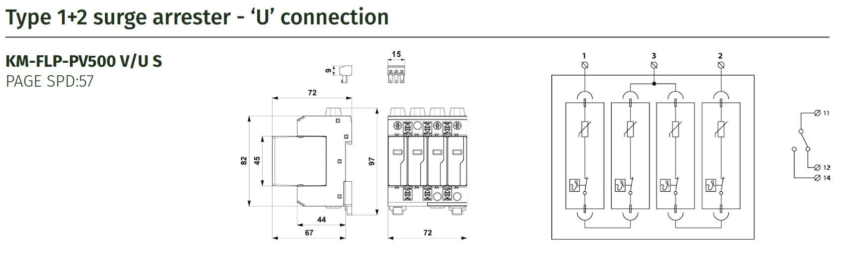 Surge arresters for use in photovoltaic systems with ‘U’ connection. Protects both poles.