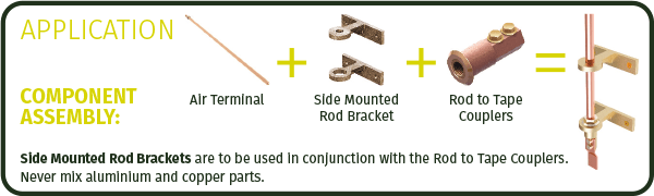 Side Mounted Rod Brackets are sold as a pair and require a Rod To Tape Coupler to connect the Air Terminal to the Down Conductor.