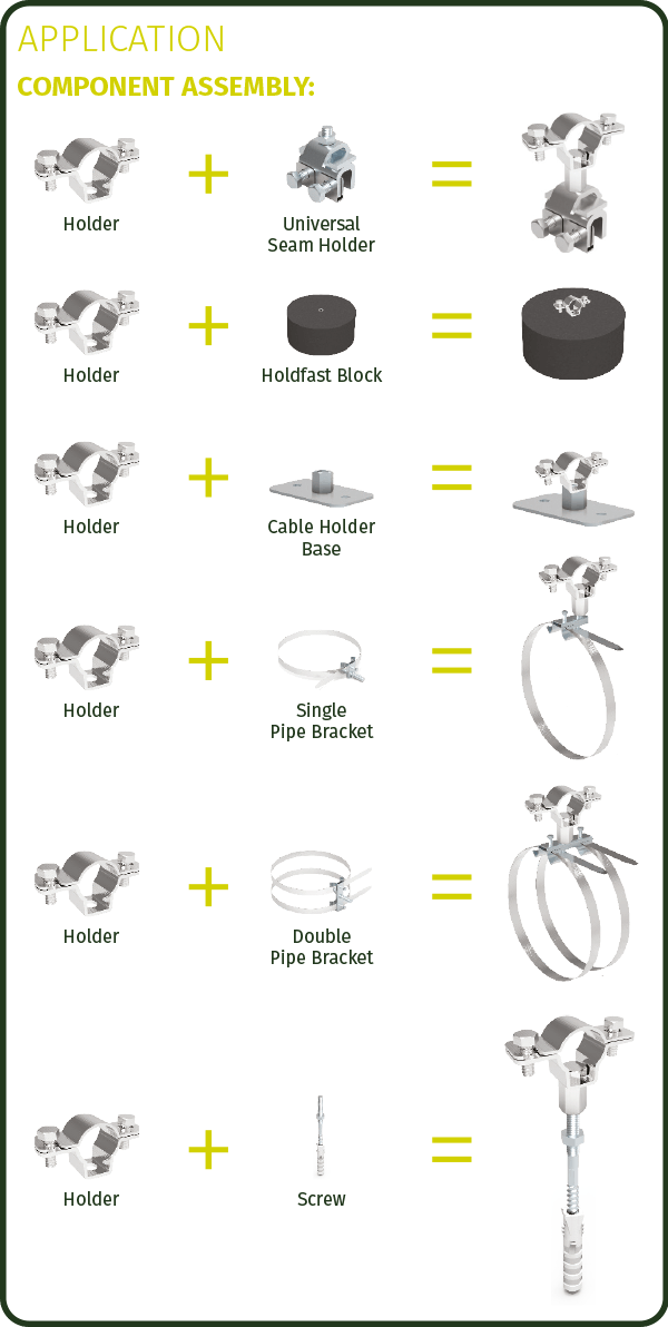 Corrosion-resistant Stainless Steel Insulated Lightning Conductor Holders are used for fixing an insulated lightning conductor to various surfaces (when used with different adapters).